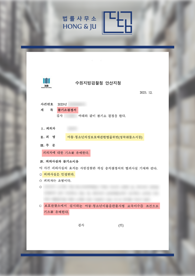 다만, 안산변호사사무실 디딤의 주장과 함께 의뢰인의 진심 어린 반성 태도, 사건 전후 정황 등을 종합적으로 고려해 기소유예 처분을 내렸습니다.